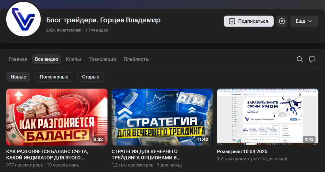Канал «Блог трейдера Горцев Владимир» ВКонтакте видео имеет 292 тысячи подписчиков. Контент практически полностью дублируется с ютуб-каналом, только здесь опубликовано свыше 1,5 тысяч видео, что больше чем на другой площадке.