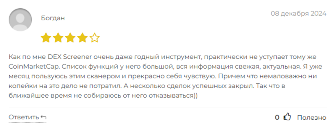Отзывы на Dex screener противоречивые. Но позитивных мнений от трейдеров в разы больше. Пользователи отмечают удобный интерфейс и простоту использования.