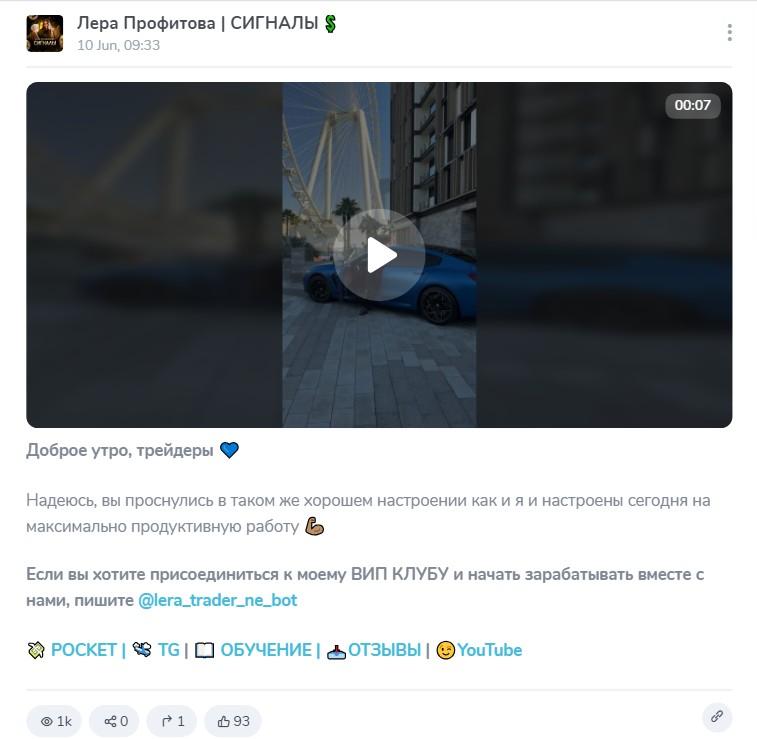 На этом канале девушка по имени Лера размещает посты, связанные с трейдингом, мотивирует подписчиков заняться торговлей и вступить в ее платный закрытый чат с отборными торговыми сигналами. В качестве платформы для трейдинга предлагает использовать сервис Pocket Option, ознакомиться с которым можно на сайте pocket lera trade com.