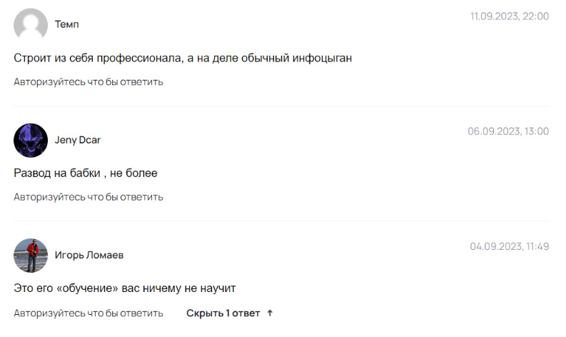 В негативных отзывах клиенты говорят, что никаких курсов он не скидывает после оплаты, а просто блокирует профиль человека после заключения сделки. Пользователи также отмечают, что он не представляет никаких лицензий, сертификатов, подтверждающих его знания.