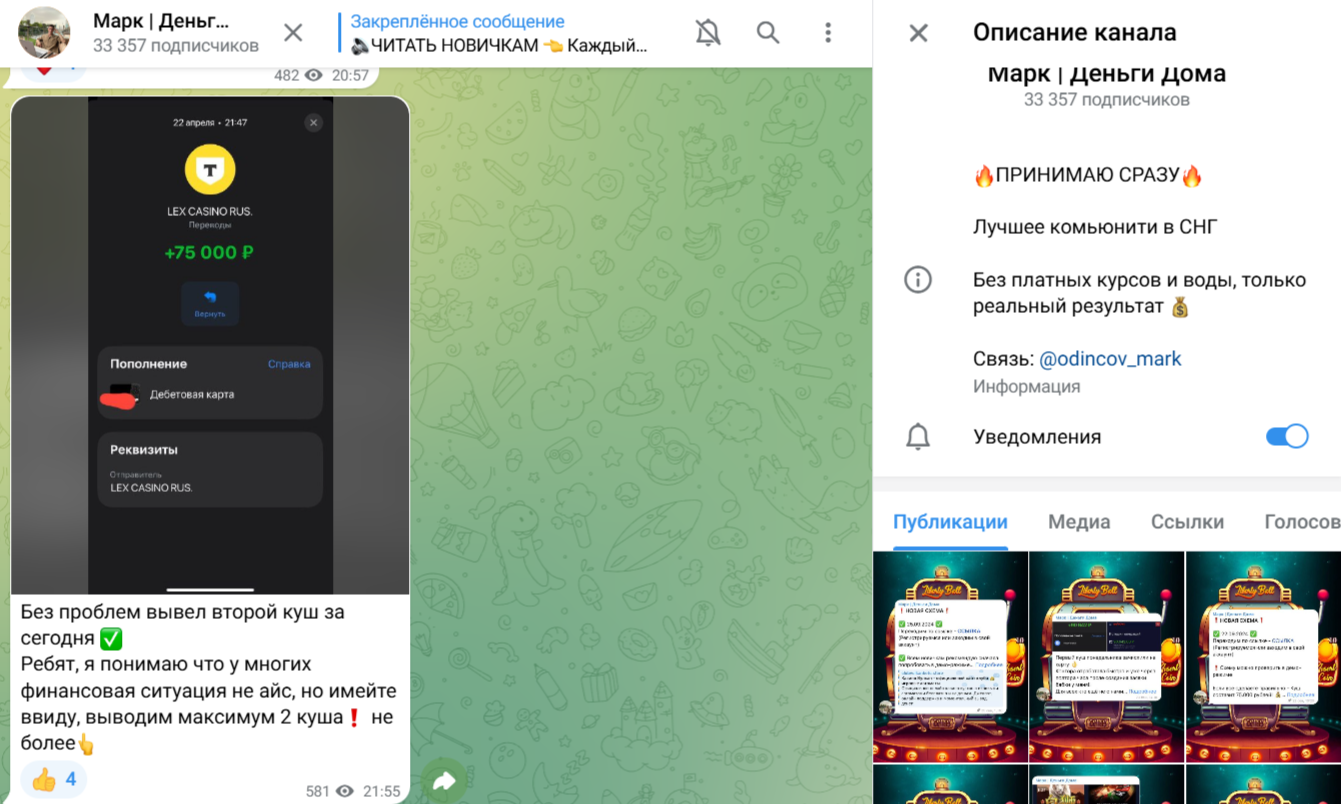 На всех своих проектах мошенник Марк Одинцово (markkodincov) вел и до сих пор ведет идентичную деятельность. Работа администратора каналов заключается в привлечении целевой аудитории в казино, а также в продаже якобы рабочих схем для выигрыша на игровых платформах. Для этого администратор использует достаточно однообразный контент: