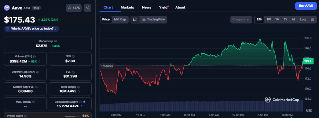Нативный токен протокола отреагировал бычьим настроением после анонса Aave App. AAVE торгуется около $175, показав рост свыше 3% за день. Существенный скачок суточного объёма торгов указывает на восстановившийся оптимизм вокруг токена.