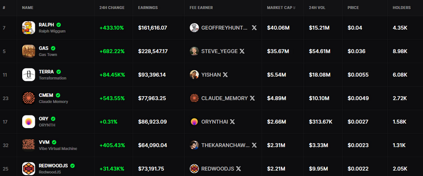 За последние 24 часа сразу несколько токенов Bags.fm продемонстрировали значительные скачки. GAS подскочил на 682%, Ralph Wiggum (RALPH) — на 433%, Claude Memory (CMEM) — на 543%, а Vibe Virtual Machine (VVM) — на 405%.