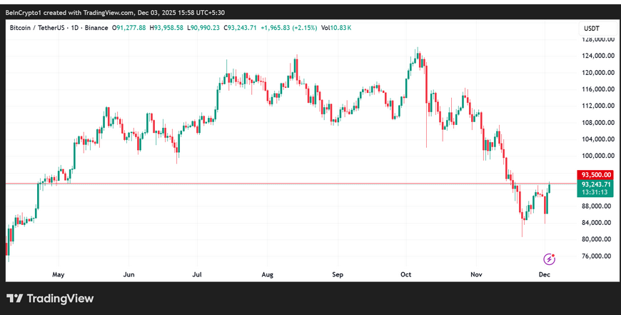 Сейчас рынок зависит от того, сможет ли биткоин вернуть критический уровень $93 500. Если BTC стабилизируется и подтвердит редкий сигнал полос Боллинджера, декабрьский V‑образный отскок может перерасти в полноценный разворот — на фоне ликвидности, институциональных потоков и сезонной силы.