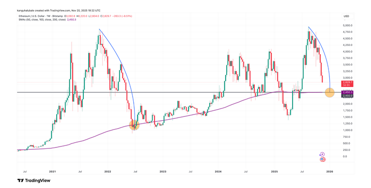 График показывает: паттерн стартует с резкого срыва от ATH 2021 года ($4800), затем — тест 200‑недельной SMA как опорной линии долгосрочного тренда.