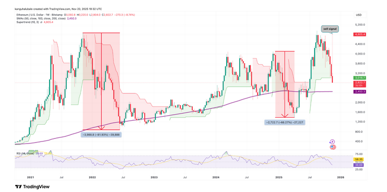 Тем временем индикатор Super Trend на недельном графике эфира зажёг sell‑сигнал. В марте 2025‑го подобный триггер завершился падением на 66%. А подтверждение в январе 2022‑го привело к просадке на 82% с формированием дна чуть ниже 200‑недельной SMA — типовая капитуляция со стоп‑аутами.