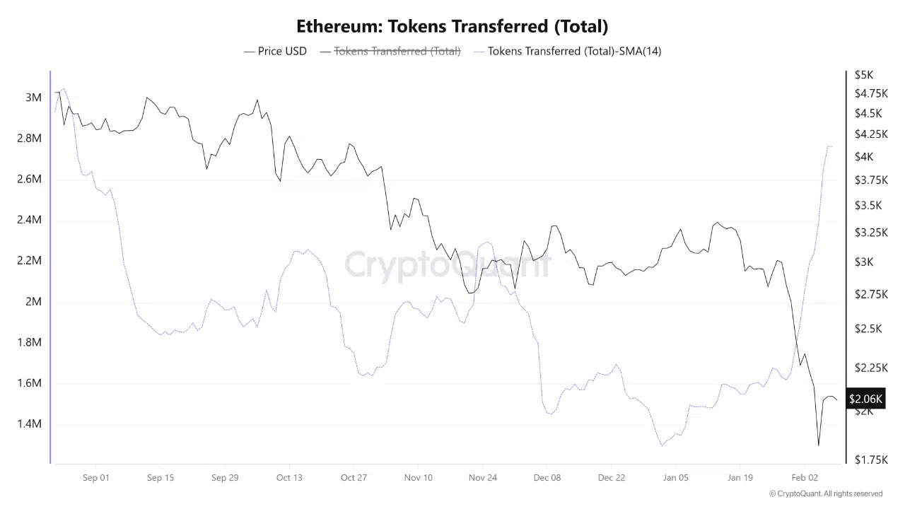 Когда ETH ускорил падение, SMA-14 по переводам резко прыгнула вверх. Показатель вырос примерно с 1,6 млн 29 января до 2,75 млн к 7 февраля. Это самый высокий уровень с августа 2025 года. Фактически локальный пик активности за последние месяцы. Такой всплеск говорит просто. Огромный объем токенов сменил владельцев почти одновременно. И все это происходило на фоне сильного давления продавцов.