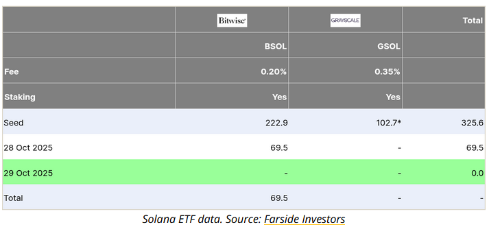 По данным Farside Investors, на текущий момент в США представлены только два Solana-ETF — от Bitwise и Grayscale. Совокупный объём стартового капитала составил $325.6 млн. При этом Bitwise уже в первый день торгов зафиксировала чистый приток в размере $69.5 млн — цифра, которая говорит сама за себя.