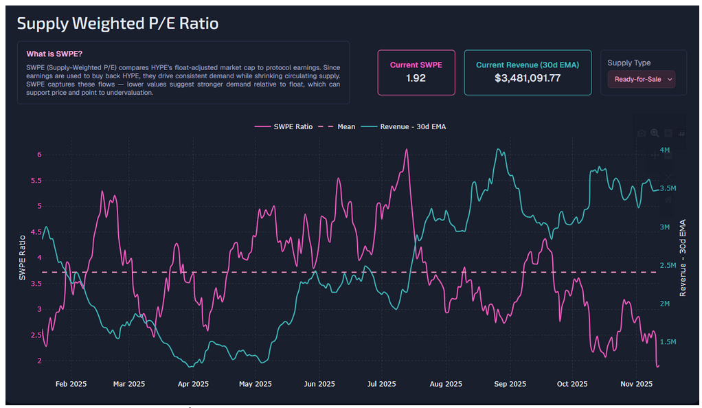 Paradigm, один из крупнейших держателей HYPE, недавно отправил большую долю своих активов в стейкинг. Экономика Hyperliquid строится на удержании токена, превращая HYPE в основу стейкинговой модели. В результате последнего шага метрика SWPE (спрос против свободного предложения) обновила минимум, что указывает на прочную поддержку HYPE.