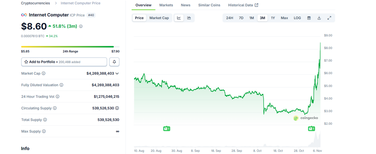 Internet Computer (ICP) достиг отметки $8.60, отскочив от недавних минимумов. В конце октября цена падала до $2.92 после глубокой коррекции. За три месяца прирост составил около 51%, хотя это всё ещё значительно ниже январского пика более $15.30. Рынок отреагировал на активизацию AI‑тематики почти вертикальным ралли, усиленным ростом деривативной торговли и шорт‑сквизом.