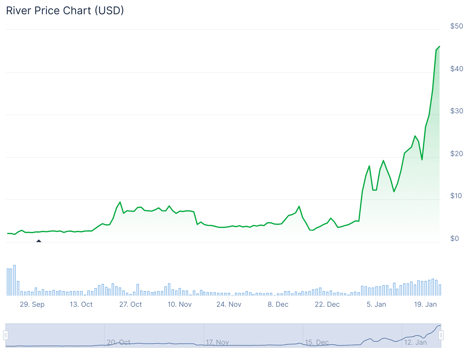 Спустя сутки после объявления о финансировании токен RIVER вырос на 24%, по данным CoinGecko, обновив исторический максимум на уровне $48,74. Рост заметно опередил динамику рынка, который в среднем прибавил около 1% за сутки. Рыночная капитализация RIVER составляет примерно $900 млн при циркулирующем объёме 19,6 млн токенов из 100 млн общего предложения.