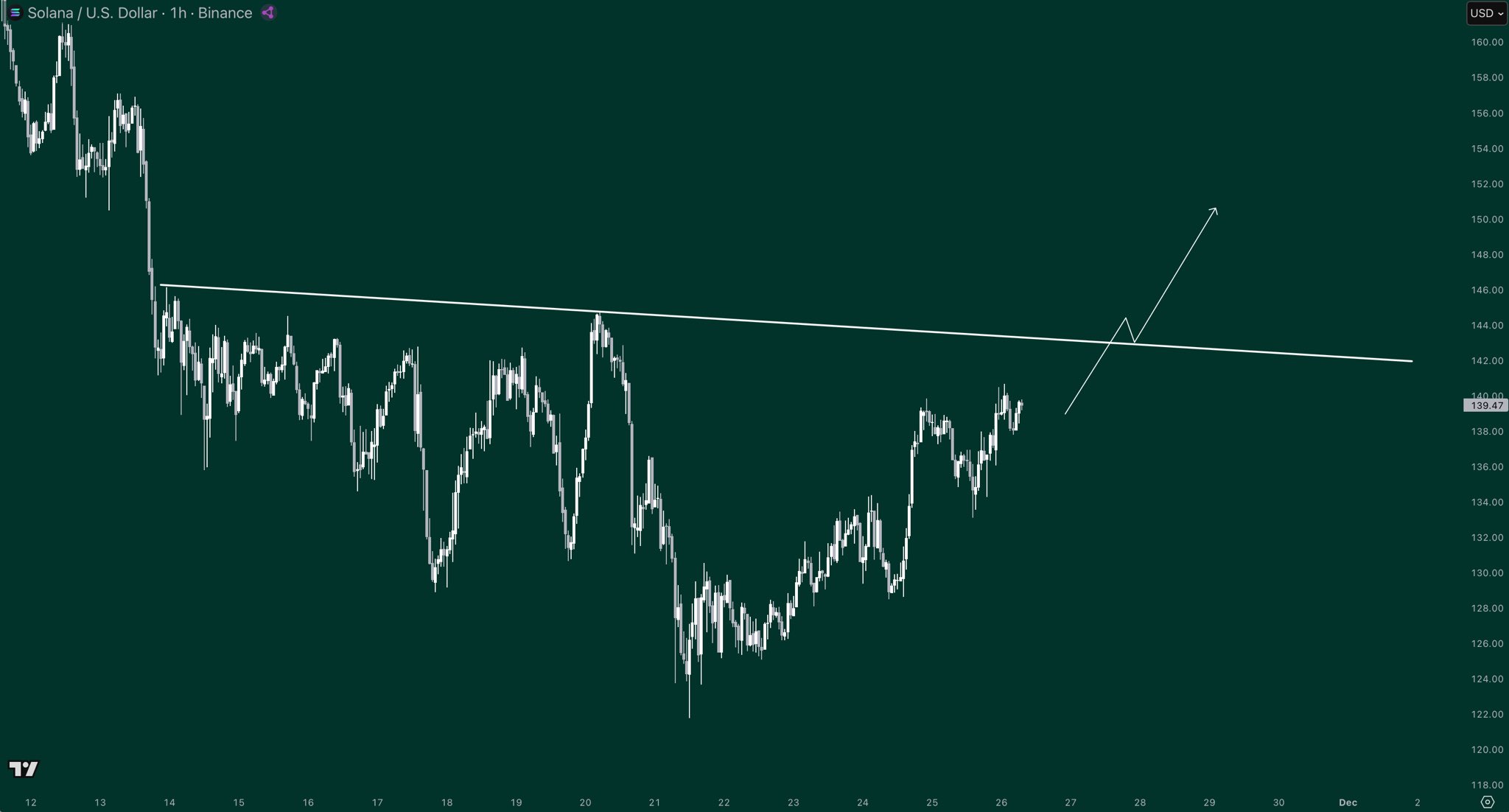 Другой аналитик, Gordon, выделяет уровень $142–144 как ключевой для смены динамики. Цена уже несколько раз не смогла пройти эту зону в ноябре. Его анализ совпадает с Faibik: серия более высоких минимумов поджимает цену к трендовой линии. По словам Gordon, закрепление выше $142–144 сместит импульс к $150–152.