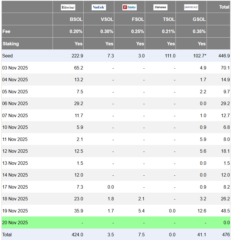 Bitwise в течение месяца выступал главным мотором притоков. С 3 по 19 ноября $BSOL аккумулировал значительный объём капитала: пик пришёлся на 3 ноября, когда Bitwise получил 65,2 млн долларов из общего дневного притока в 70,1 млн; остальные 4,9 млн ушли к Grayscale. Привлекательность $BSOL усиливает низкая комиссия в 0,20 % — фактически самый дешёвый прайс в сегменте. Доминирование Bitwise создало сценарий целенаправленного накопления: инвесторы используют коррекцию цены, чтобы увеличить долю. Руководство компании подчёркивает, что многие институции воспринимают слабость цены как временный лаг и ждут восстановления при улучшении общего сентимента.